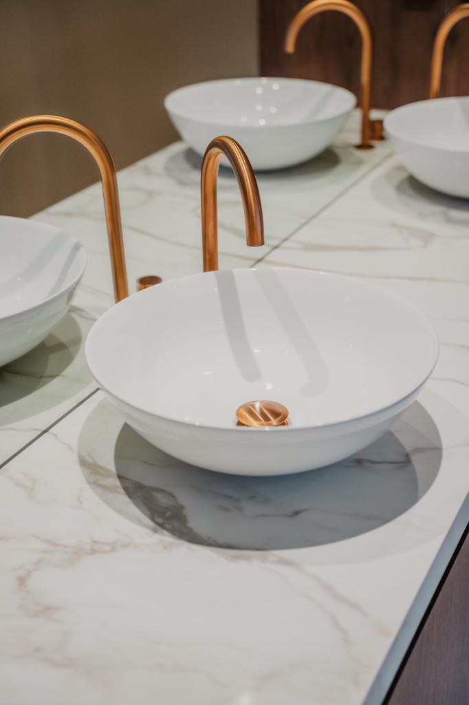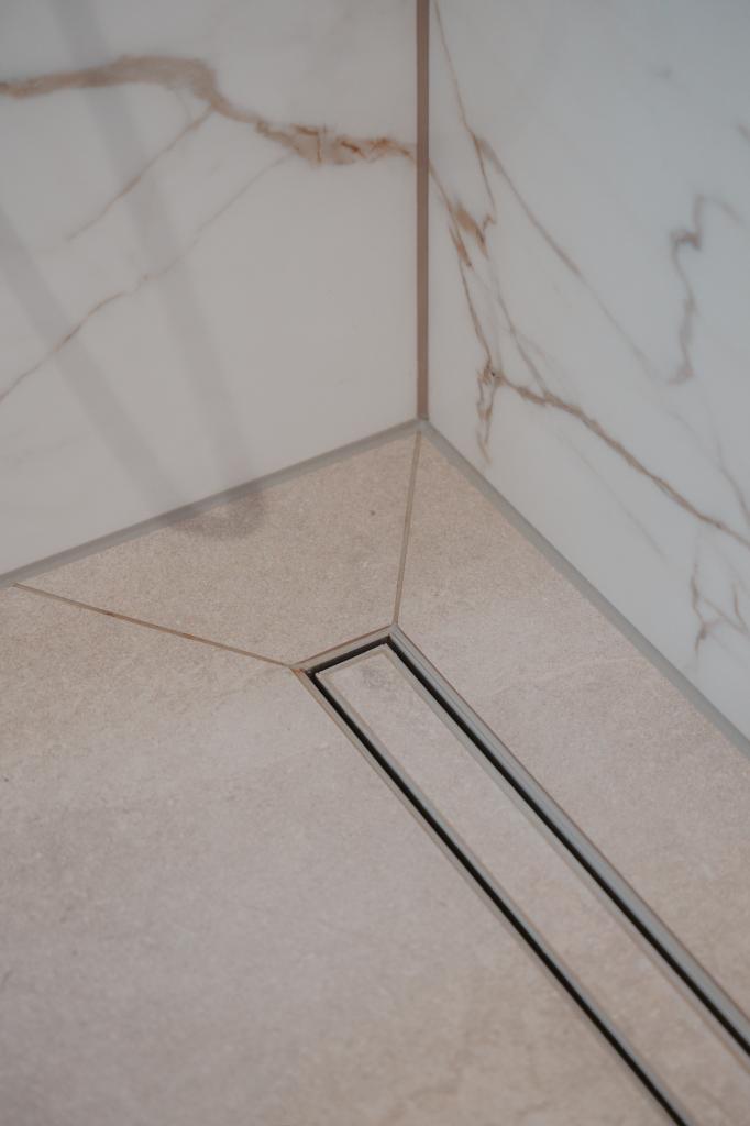 Werken met slabs vraagt om precisie, ervaring en nauwkeurige afstemming. Onze tegelzetters zorgen ervoor dat elke plaat strak aansluit en optimaal hecht, zodat er geen spanning of holklinkende delen ontstaan. Dat vakwerk is hier duidelijk zichtbaar: de tegels vormen één rustig geheel dat perfect past bij de aardse tinten die deze badkamer zo warm maken.