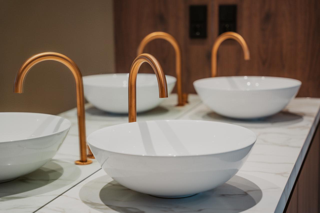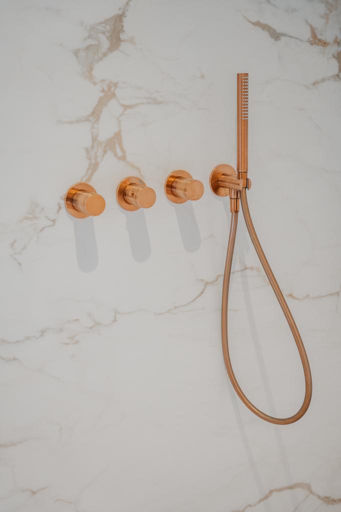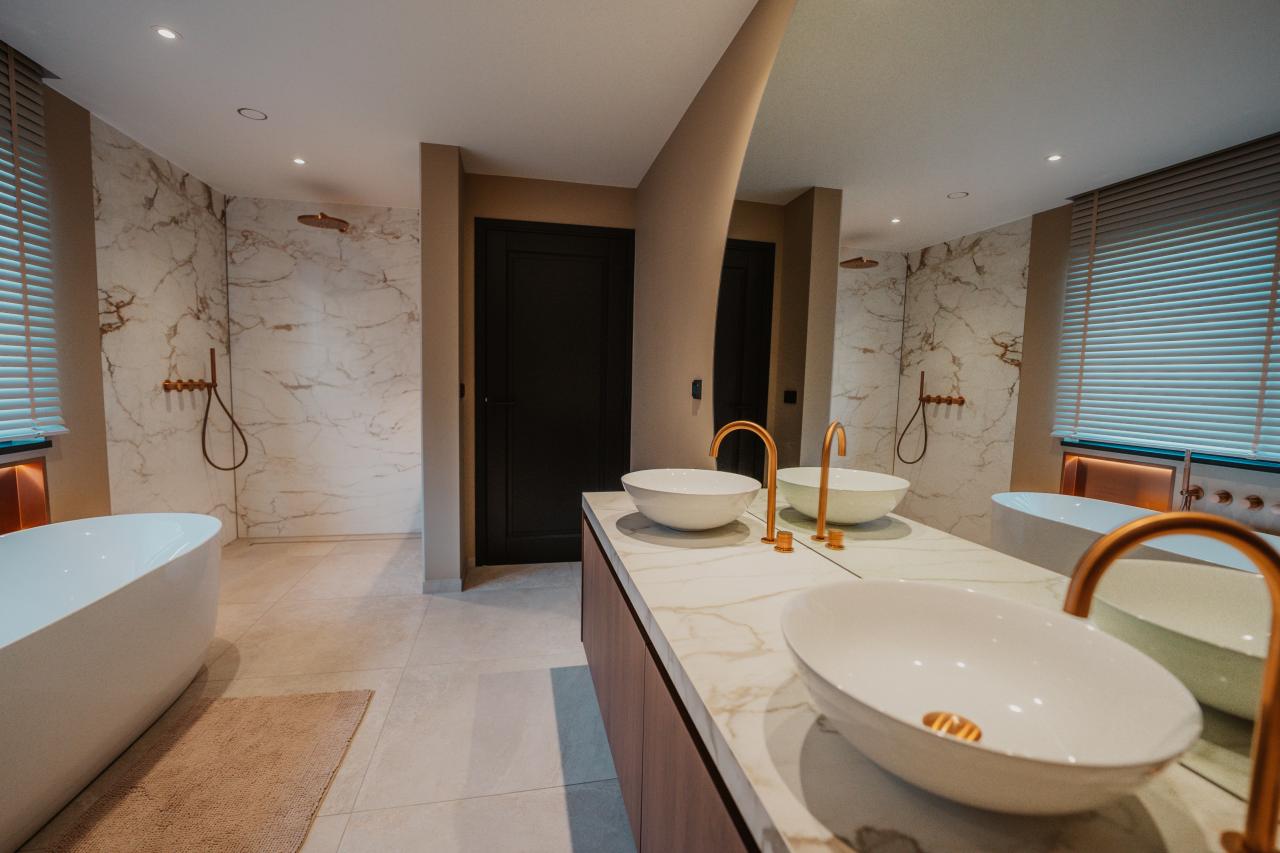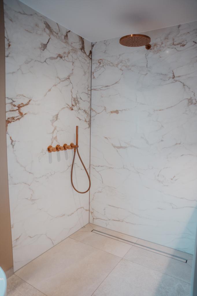 In Gulpen realiseerden onze tegelzetters een badkamer met een uitstraling die doet denken aan een luxe hotel. De ruimte is volledig bekleed met XXL marmerlook slabs (300×150×0,6 cm): grote wandpanelen met subtiele goud- en grijstinten die elegant doorlopen over de volledige hoogte. Door het minimale aantal voegen oogt de badkamer ruimer en rustiger, wat zorgt voor een bijzonder verfijnde sfeer.