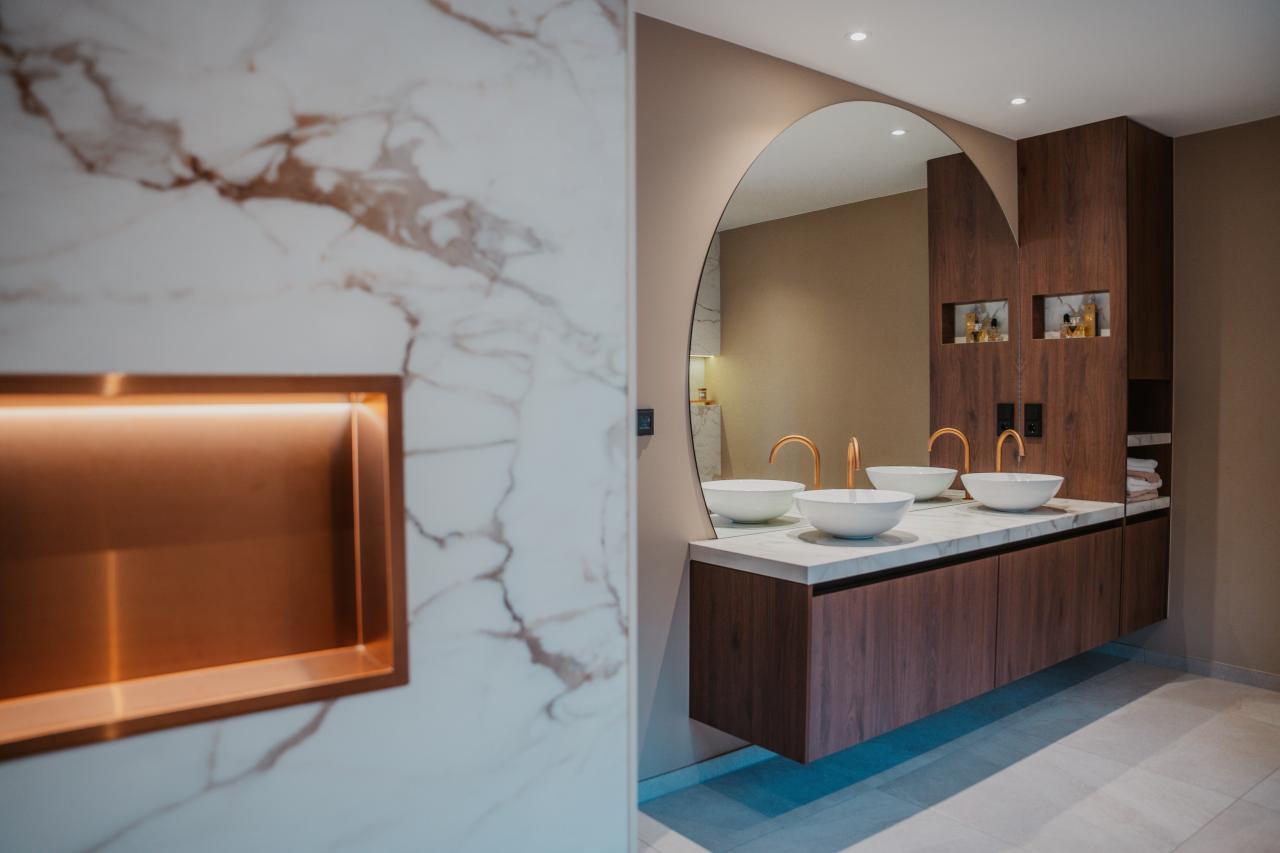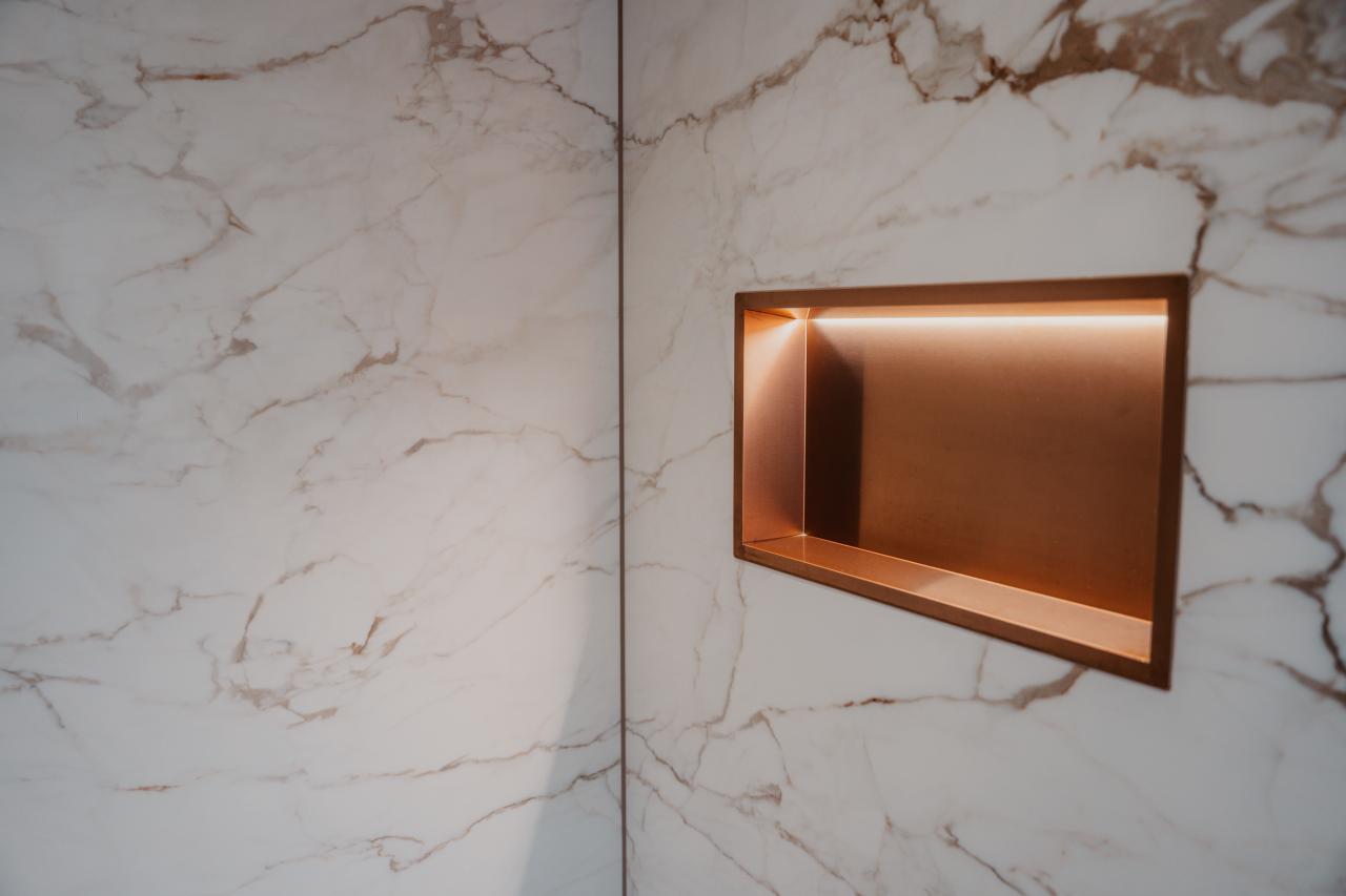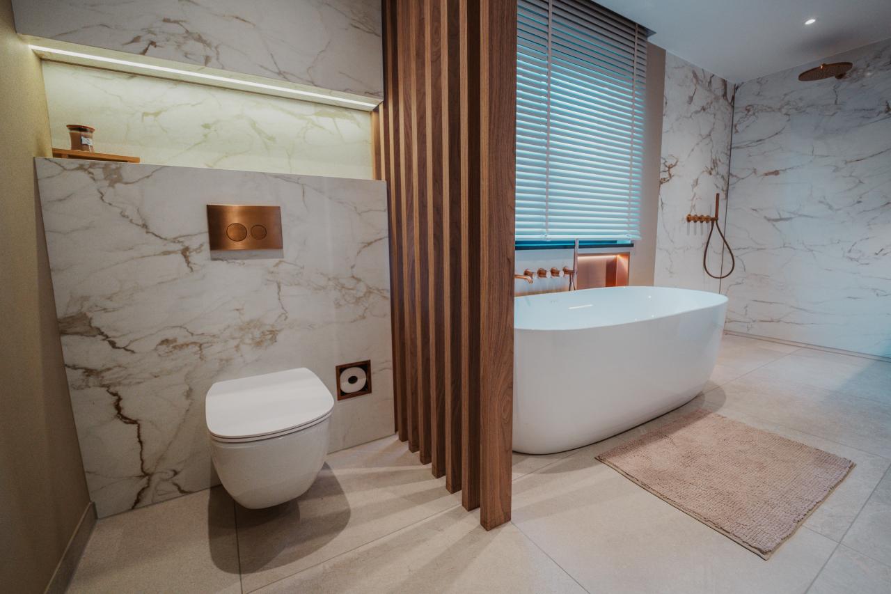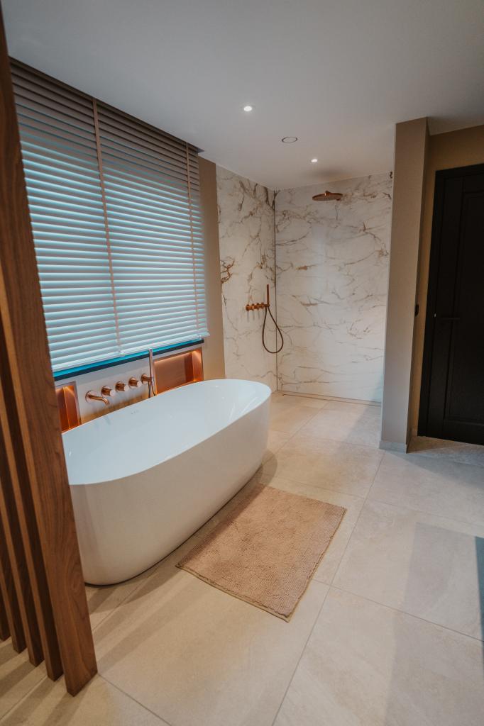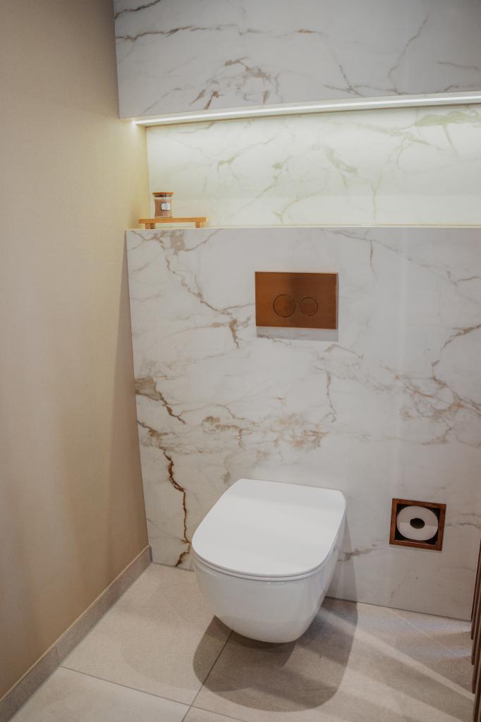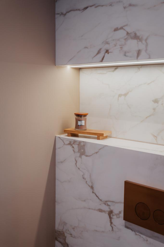 Het totaal ontwerp combineert de luxe van marmerlook met de warmte van een beige betonlook vloer, waardoor er een evenwicht ontstaat tussen elegantie en natuurlijke sereniteit. De ingebouwde nis achter het toilet maakt het geheel compleet en voegt een praktische en stijlvolle detailtoevoeging toe aan dit badkamer ontwerp.