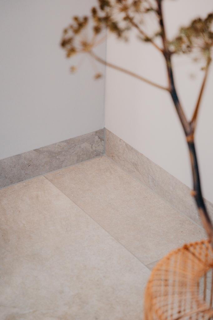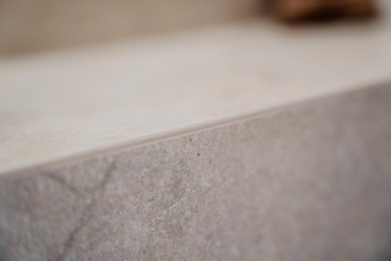 De ruime inloopdouche, het ton-sur-ton kleurenpalet en de natuurlijke materialen maken van deze badkamer een plek vol comfort en zachtheid. De beige tegels zijn makkelijk te combineren en brengen direct een kalme sfeer in de ruimte.