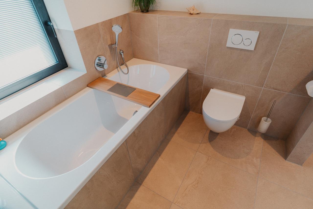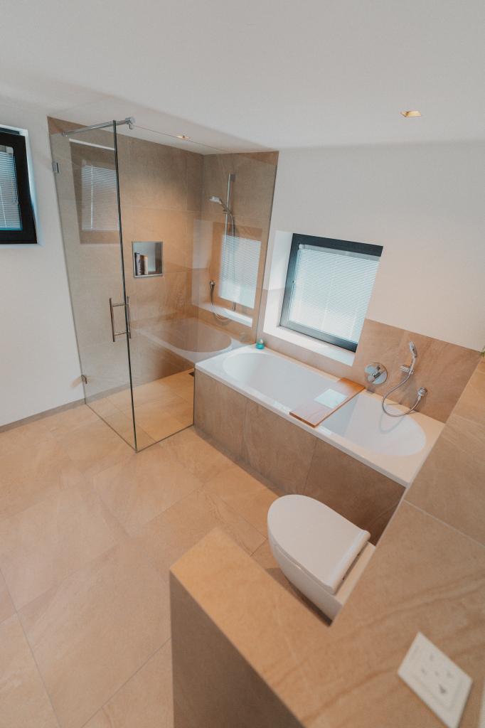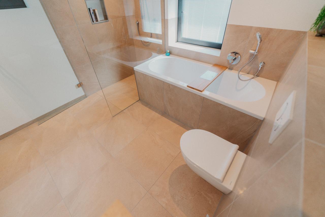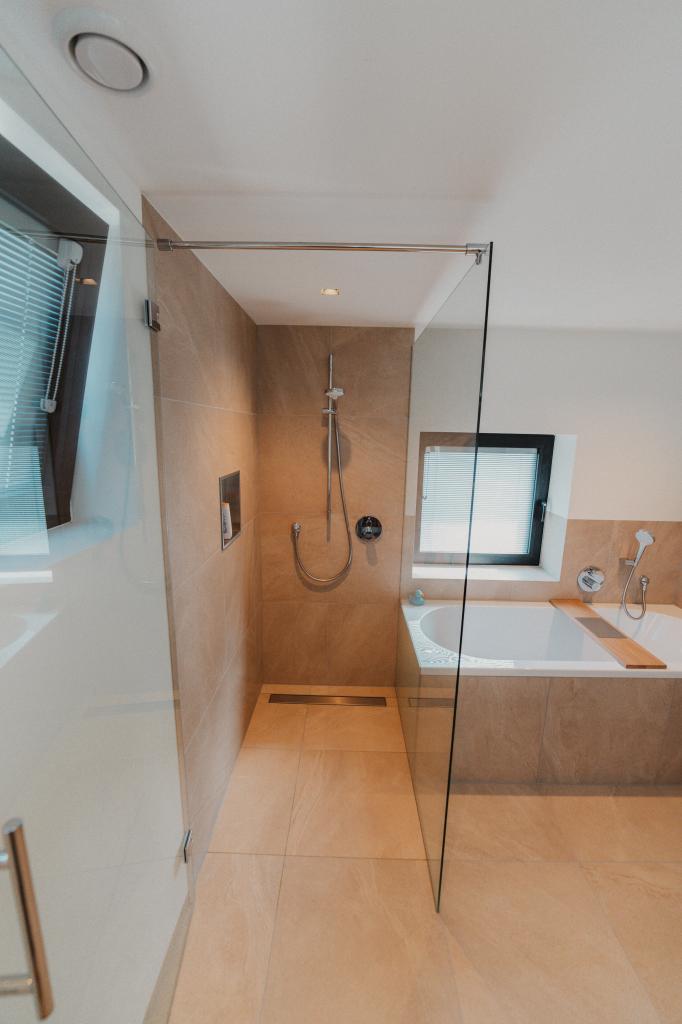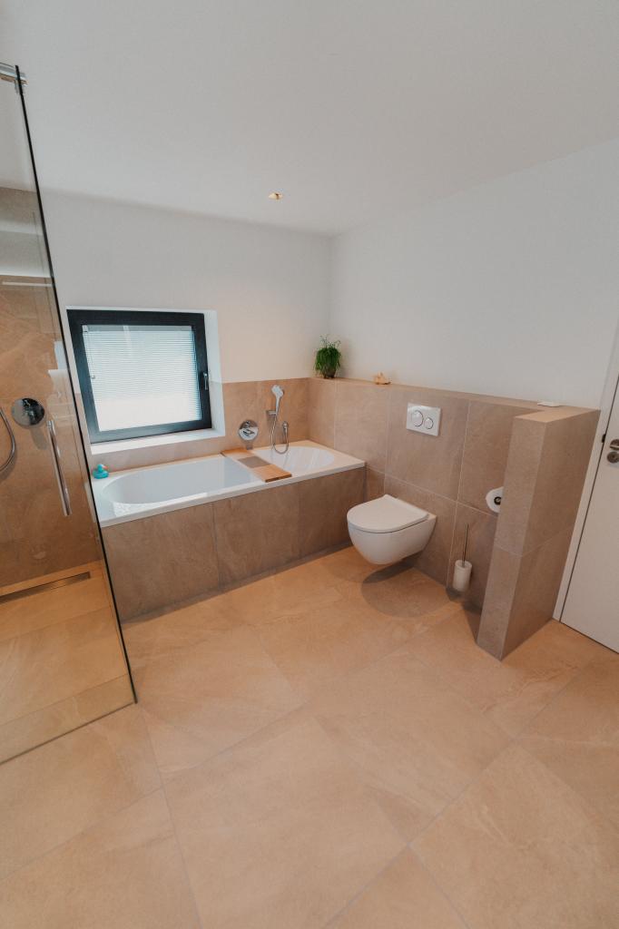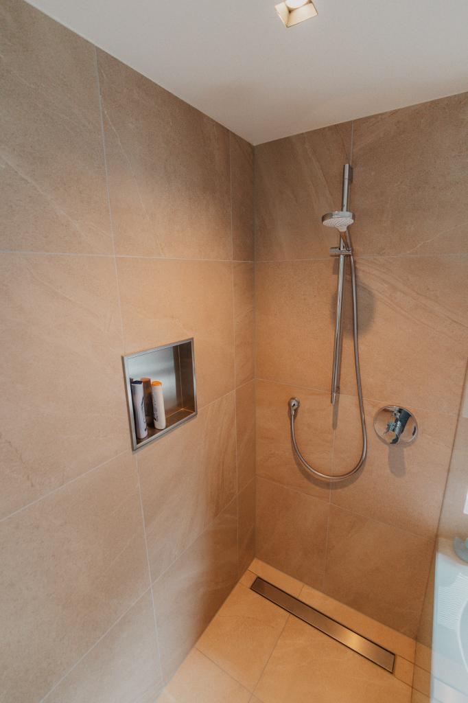 Onze tegelzetters besteden bij het betegelen van badkamers altijd extra aandacht aan de waterdichting. Er wordt gewerkt volgens de strenge Duitse normering, waarbij volledige waterdichte afwerking de standaard is. In combinatie met hoogwaardige afdichtingssystemen biedt dit maximale zekerheid tegen lekkages en scheuren. De gekozen tegels geven deze badkamer in Heerlen een luxe en rustige uitstraling, terwijl de strakke lijnen en minimalistische afwerking het ontwerp versterken.